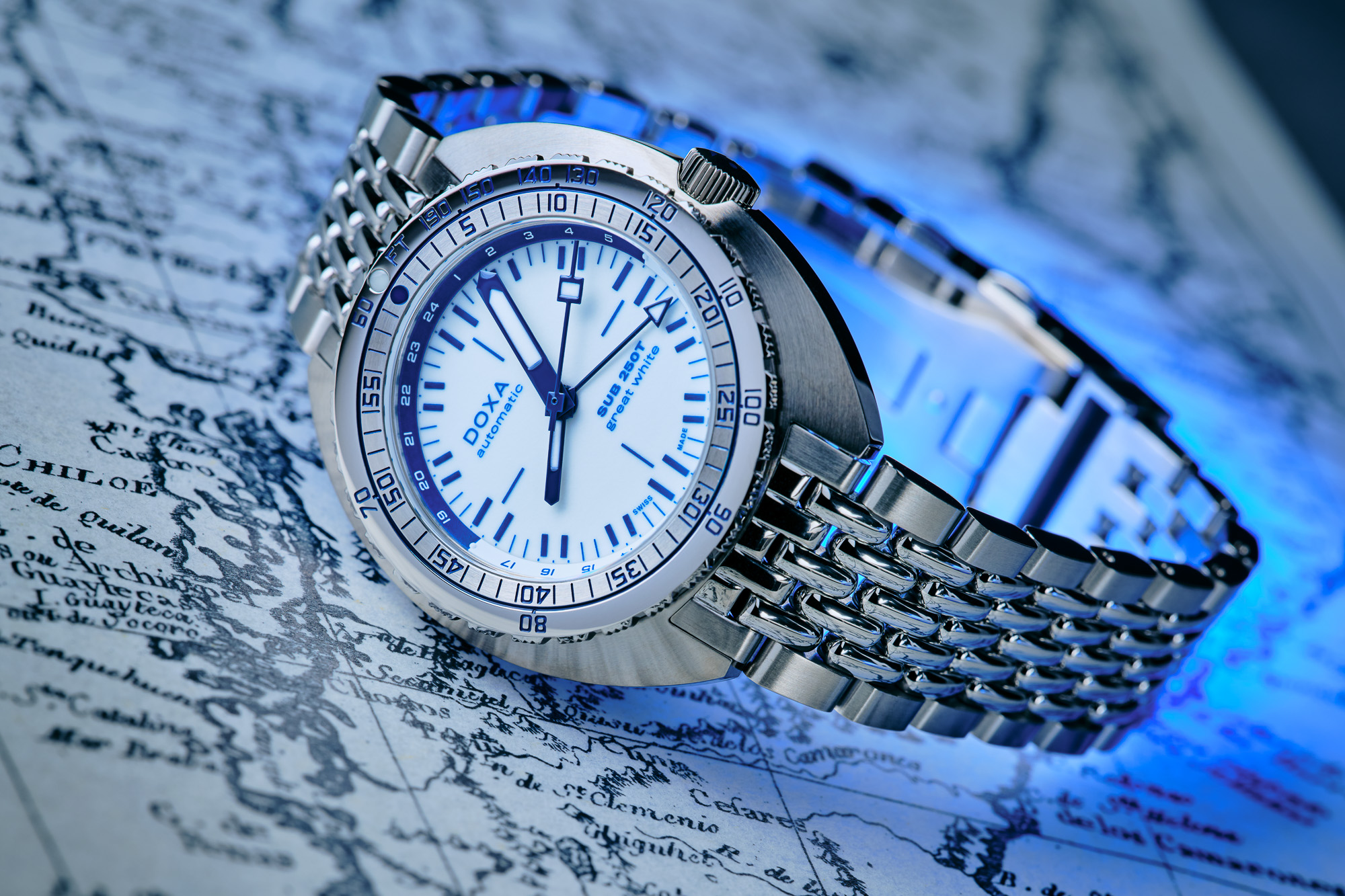 Estamos ante una caja de 40 mm en acero con la forma clásica cushion tan representativa de Doxa, también enmarcada con los biseles con la regla de cálculo de las asociaciones norteamericanas para medir los tiempos de inmersión (además de que la manufactura fue la creadora del bisel unidireccional) con doble marca para el agarre. Una de las grandes diferencias junto a la función GMT recién incorporada es el fondo de un blanco tipo opalina que prefiere prescindir del fechador para acentuar la simetría de la carátula. Ese color en realidad es puro lumen, lo que hace que ya no agujas y numerales brillen en la oscuridad sino todo lo contrario. Esta vuelta de tuerca le da un aspecto totalmente innovador toda vez que, como buzo, lo encuentro sumamente útil a la hora de optimizar visibilidad.
